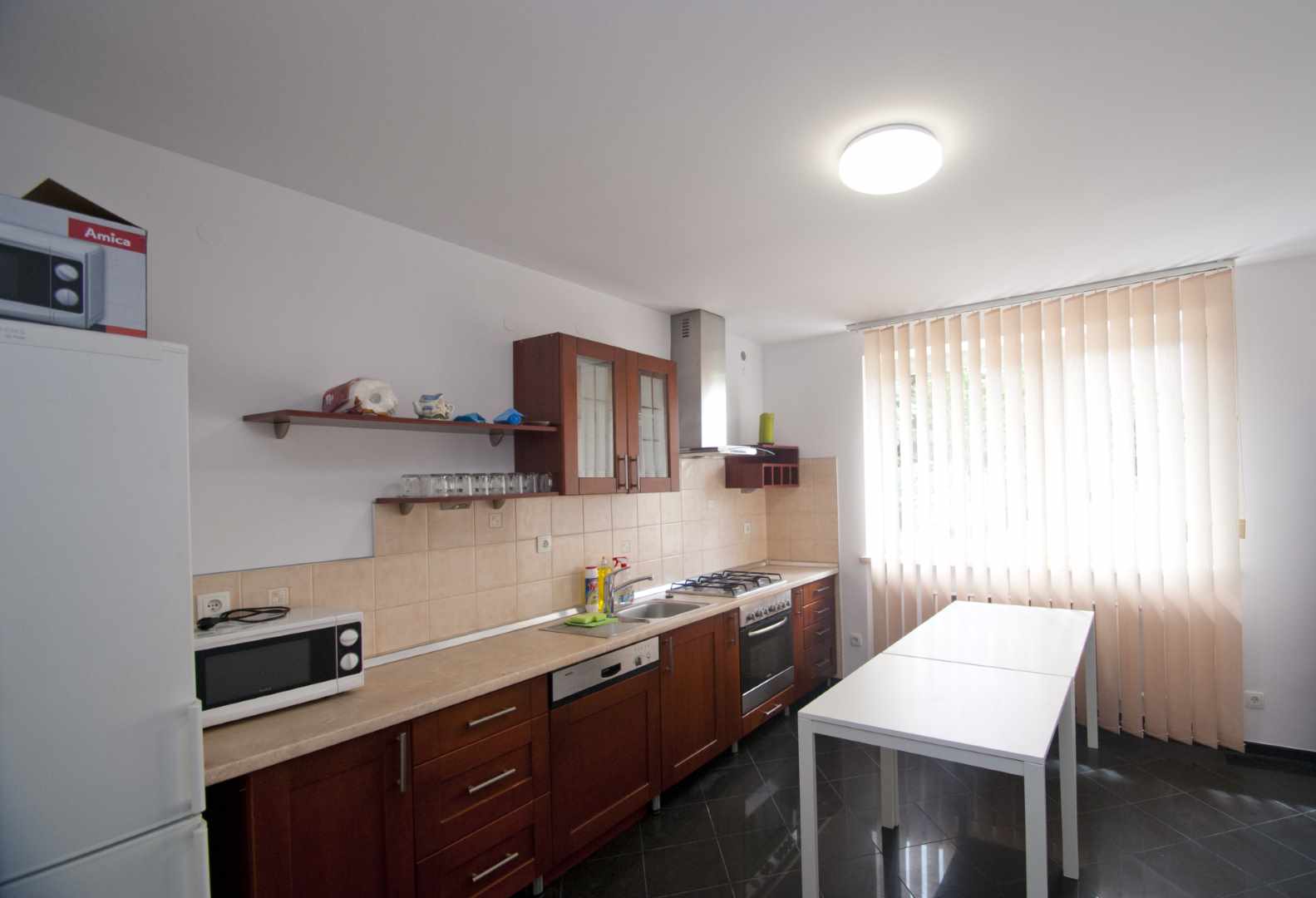 Na parterze kuchnia wspólna, wyposażona w dwie lodówki z zamrażalnikiem, piekarnik, kuchenkę mikrofalową, czajnik, podstawowe naczynia, stoły i krzesła.