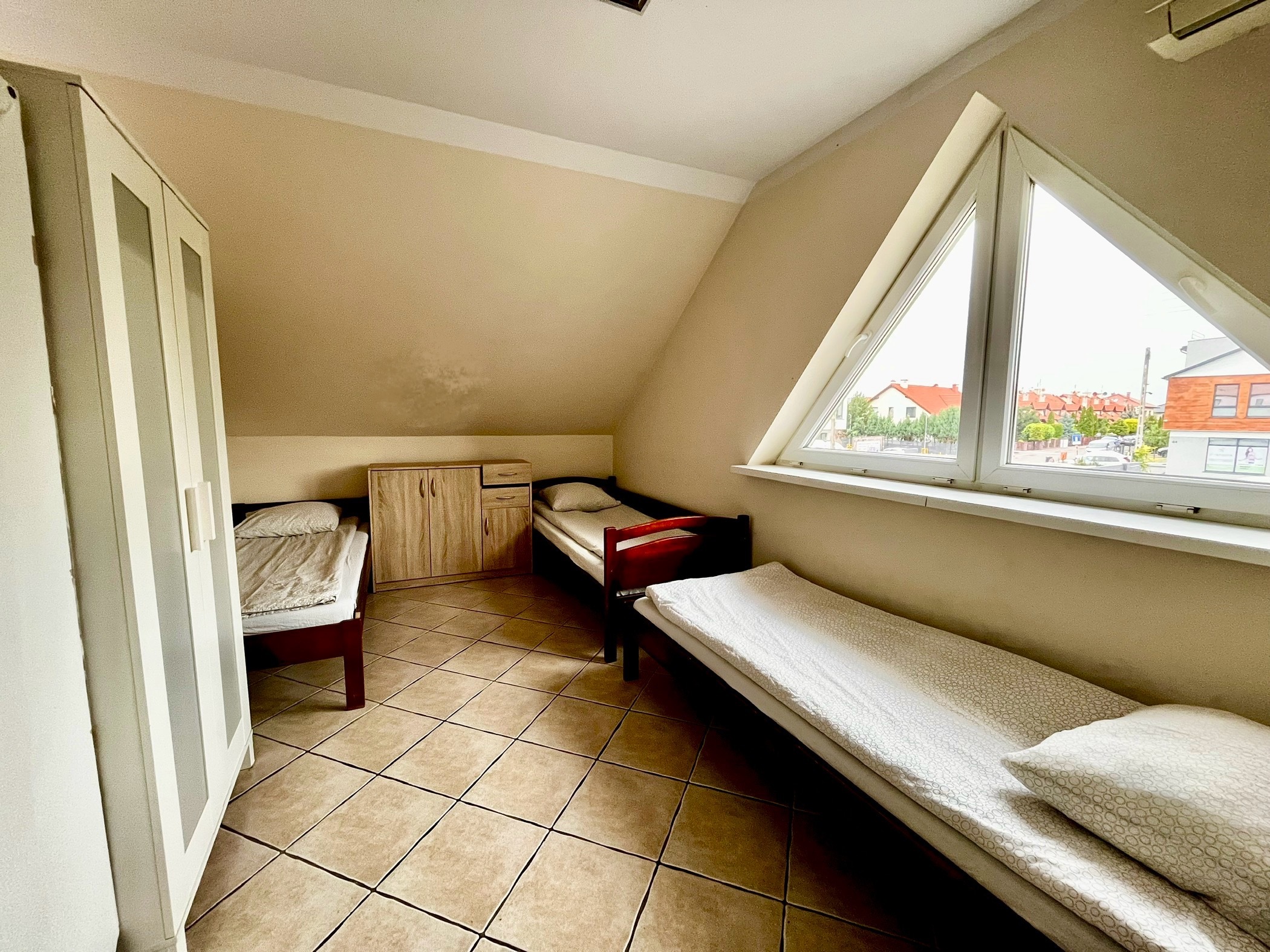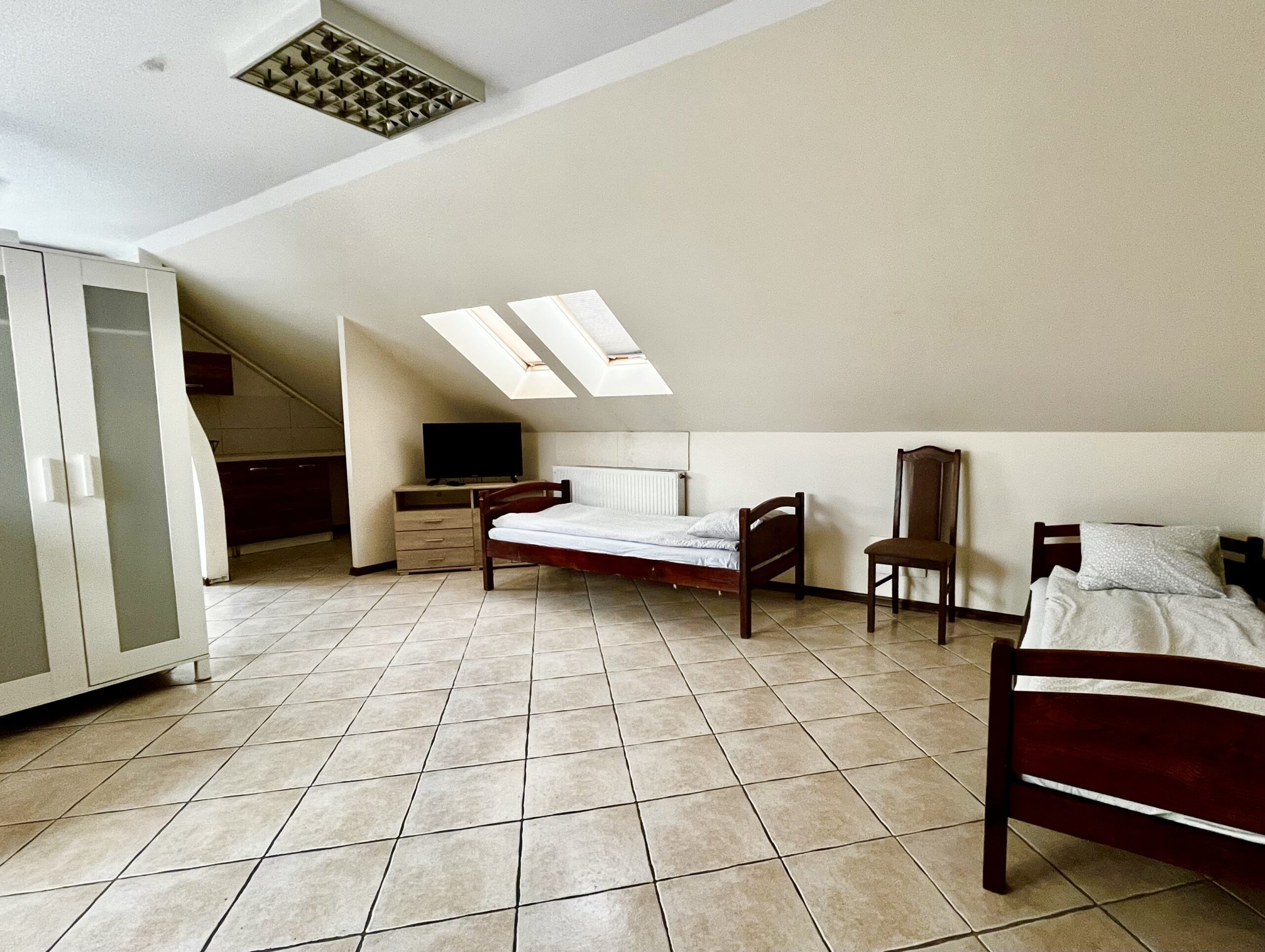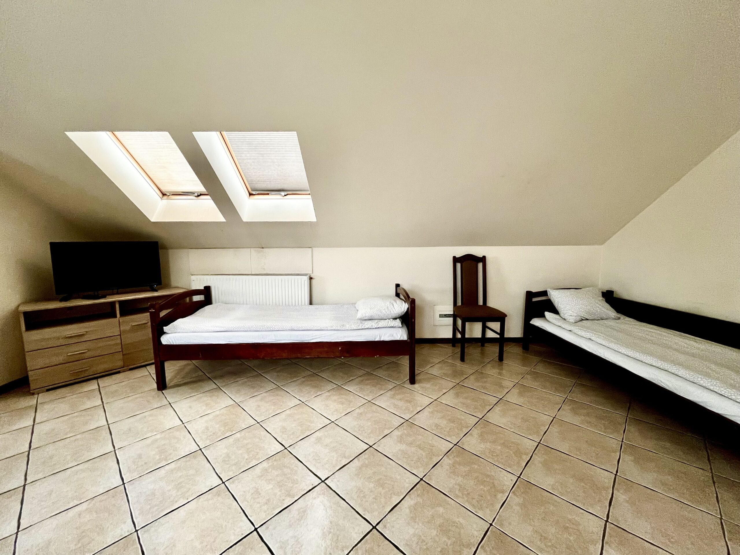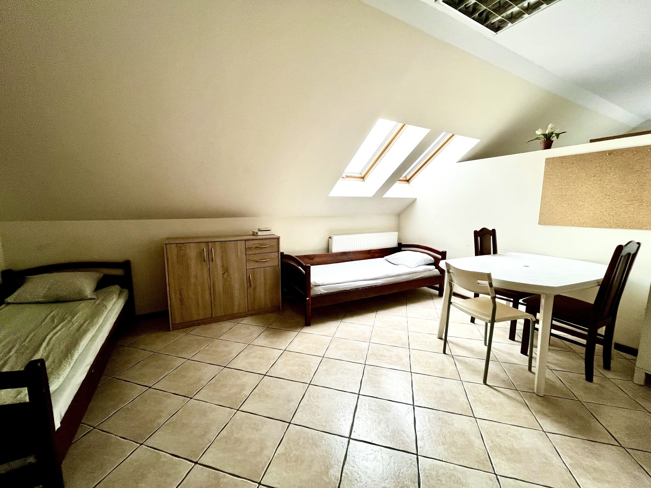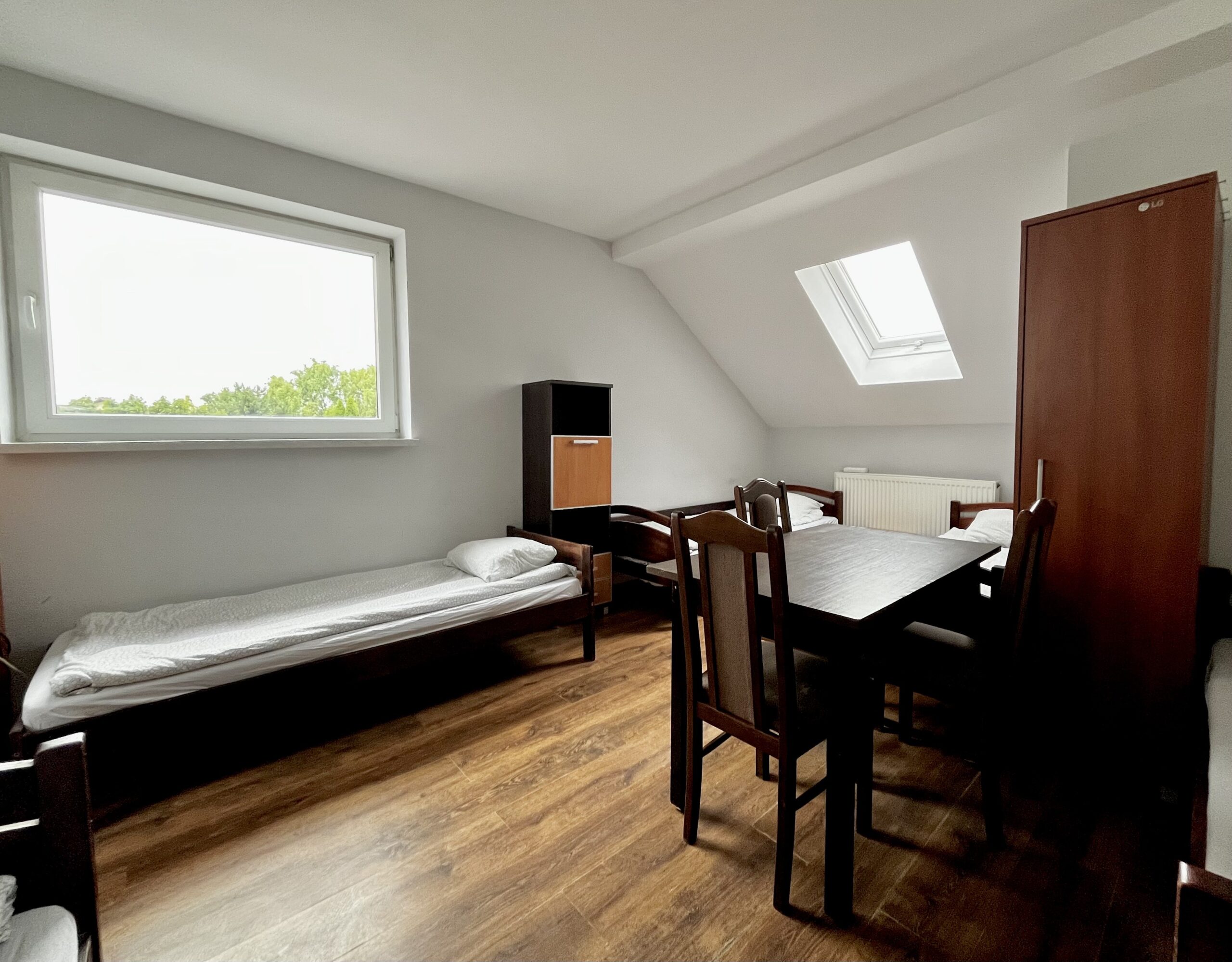 Przedstawiamy Państwu duży siedmioosobowy pokój, który posiada siedem wygodnych, pojedynczych łóżek.Rozkład pomieszczenia pozwala na komfortowy pobyt tej liczby osób, dzięki ściankom działowym każdy ma zapewnione miejsce prywatności. Dodatkowo w pokoju znajduje się również miejsce do przechowywania produktów spożywczych oraz wstępnego przygotowania posiłków.Wspólna kuchnia oraz łazienka na korytarzu zapewniają podstawowe wyposażenie do krótkiego, a także dłuższego pobytu.