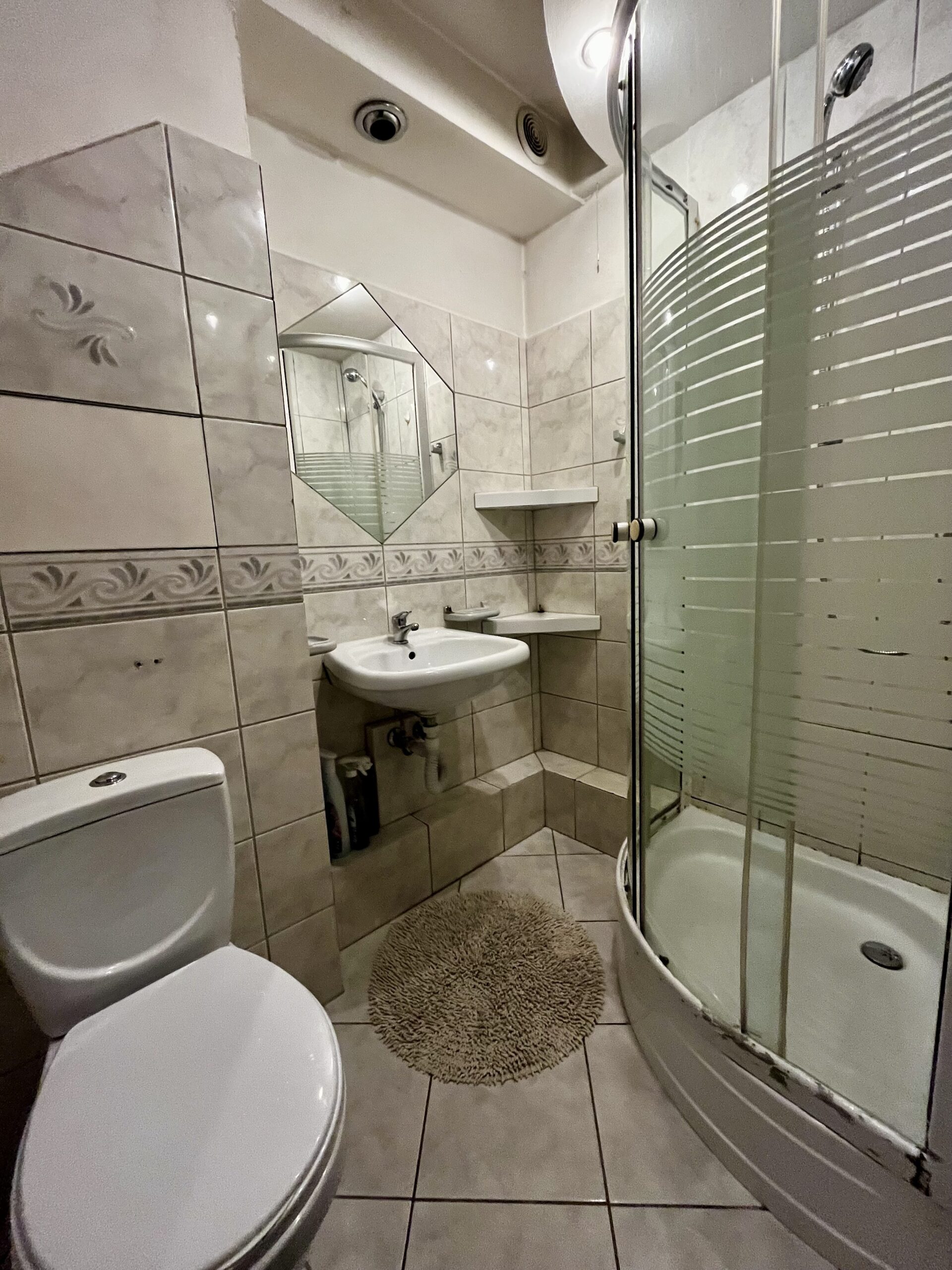 Łazienka wraz z ubikacją, prysznicem i umywalką.