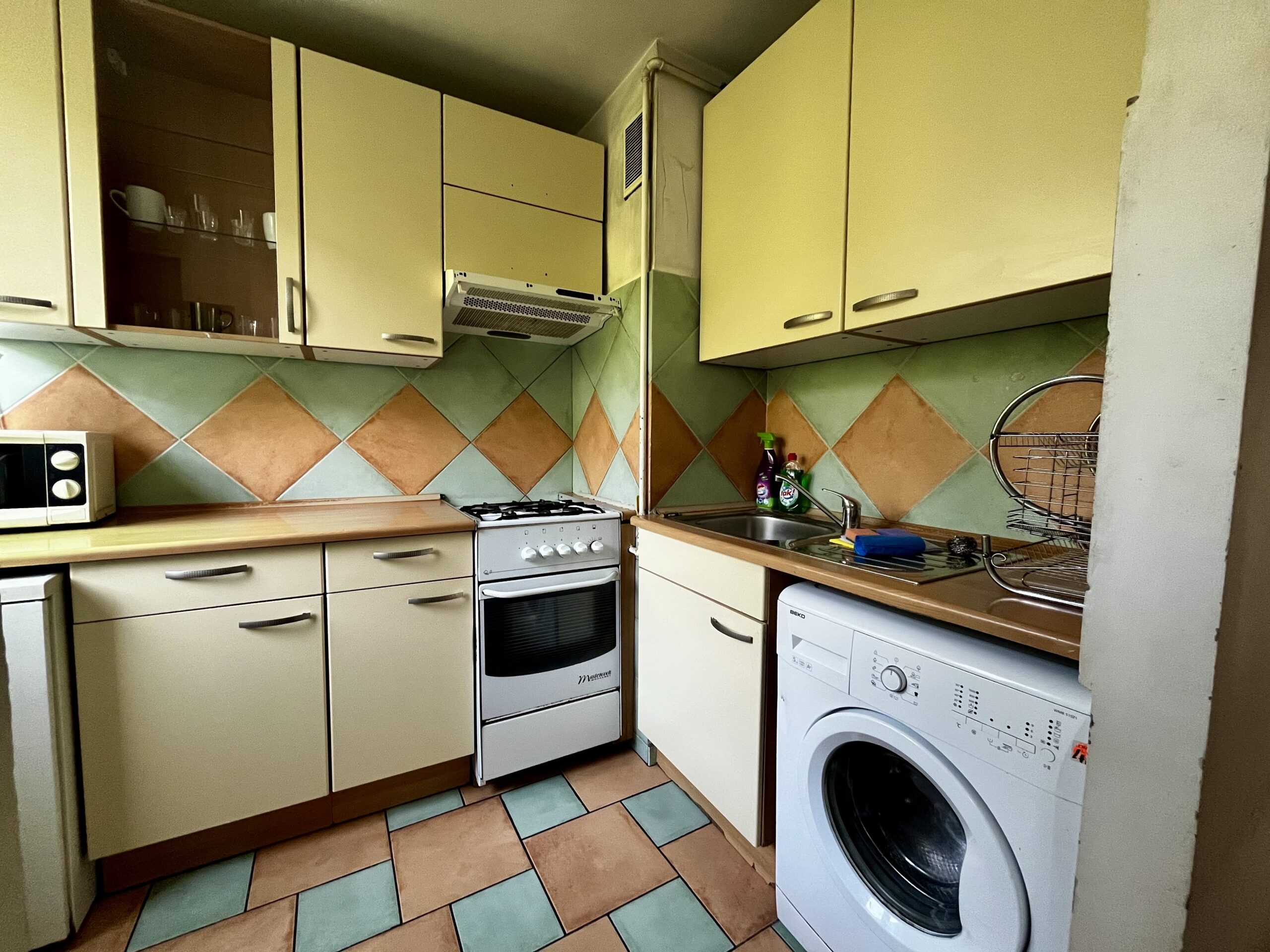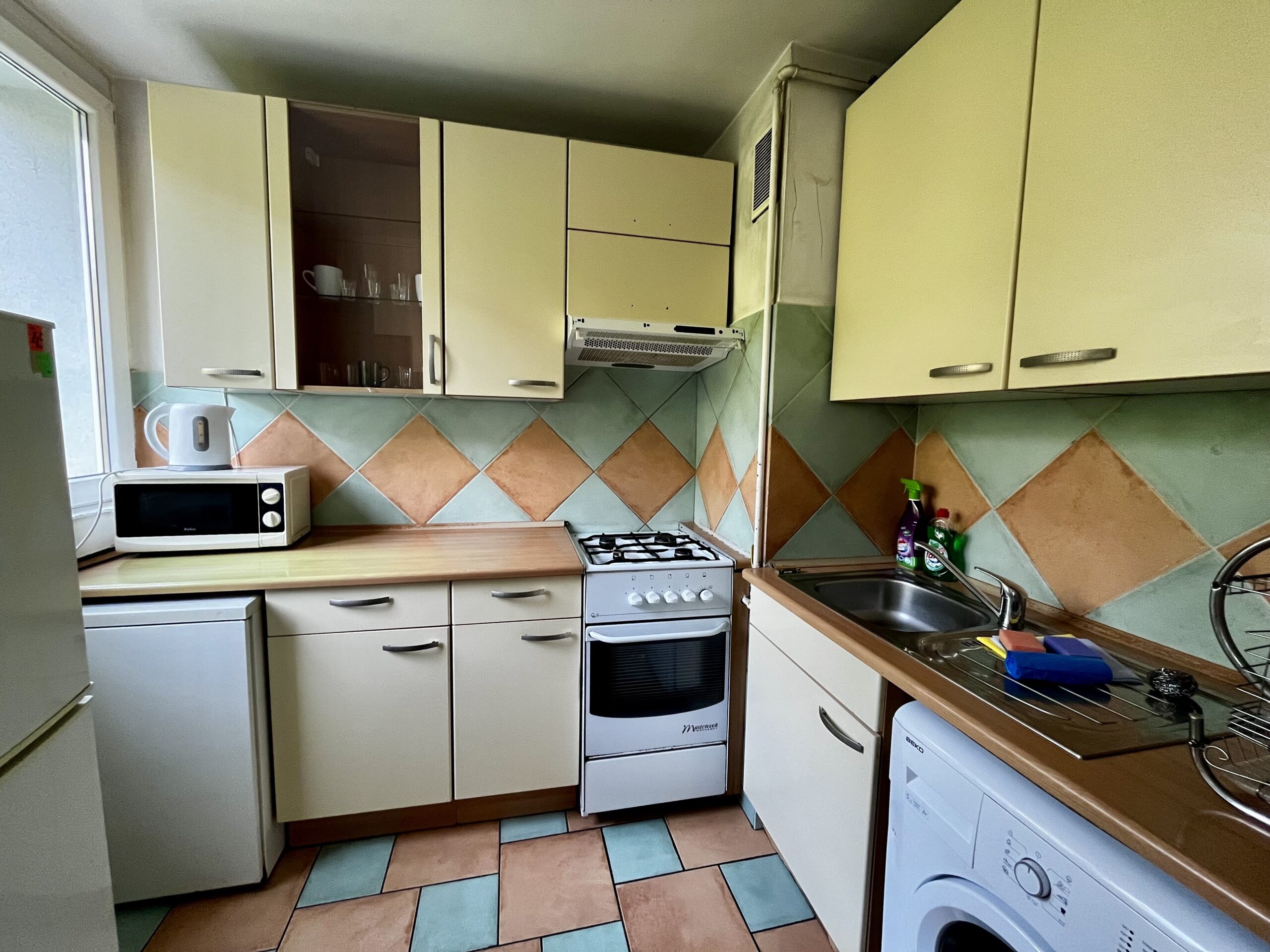 Mieszkanie w bloku na parterze zawiera również kuchnię wyposażoną w lodówkę, piekarnik, okap i pralkę, czajnik oraz podstawowe naczynia.